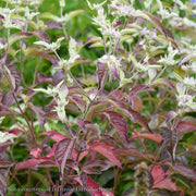 Pycnanthemum x incanum 'Smokey Mountain Mint' is a striking native hybrid distinguished by its shimmering silvery-green new growth and smoky gray-purple lower foliage. This cultivar reaches 24 to 30 inches tall and produces clusters of delicate white flowers with lavender spots, framed by luminous silver bracts that persist from summer through frost. Plant Patent Applied For.