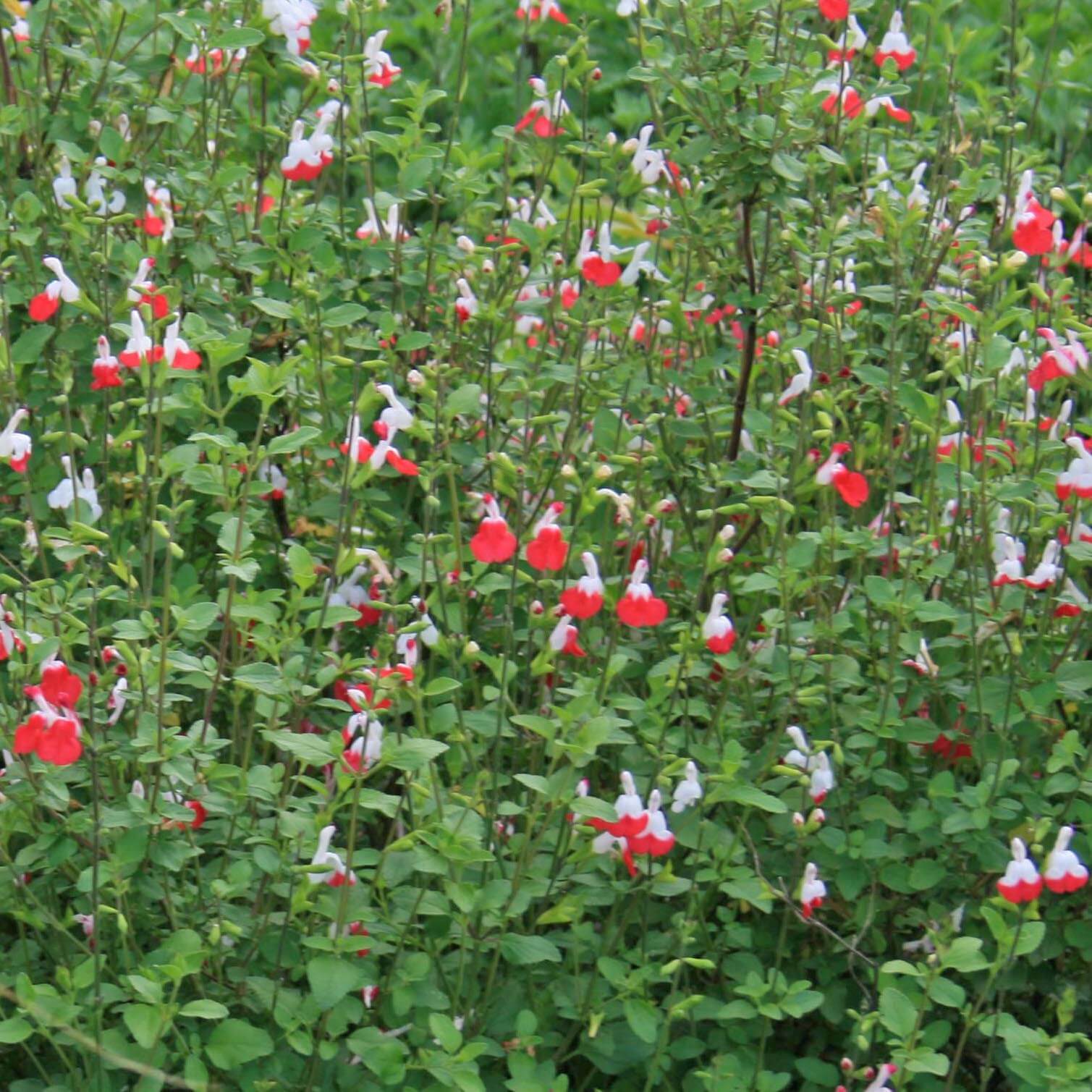 Salvia microphylla 'Hot Lips' has unique, two-toned, red and white flowers that bloom over aromatic green foliage on semi-woody stems. The blooms become completely red during the high heat of summer and return to red and white as the weather cools. Commonly referred to as Texas Autumn Sage or Little-leaf Sage, this plant makes a bright, bold statement with long-blooming flowers beginning in spring and into the fall.