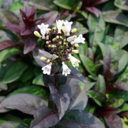 Penstemon digitalis 'Husker Red' has red-flushed green foliage that turns an attractive burgundy-maroon in winter. 'Husker Red' forms an upright clump that is topped by spikes of tubular white flowers in early summer. It is very attractive to pollinators. An evergreen perennial, Penstemon 'Husker Red' was selected as the 1996 'Perennial Plant of the Year' by the Perennial Plant Association.
