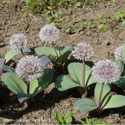 Allium karataviense, commonly known as an Ornamental Onion, has relatively large spherical clusters of light pink blooms that are produced on short stems in early summer. The plant only stands between 4 inches and 10 inches tall. Despite the small stature, Allium karataviense stands out due to its very wide blueish-green leaves that anchor the plant and make a great addition to the front of a border. The unique leaf adds an additional layer of texture and depth to any planting scheme.