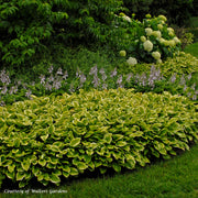 Hosta ‘Golden Tiara’ presents a stunning display of variegated leaves with shades of golden yellow surrounded by dark green edges. Bushy and showy, Hosta ‘Golden Tiara’ forms in compact mounds of rounded heart-shaped leaves that produce lavender blooms on slender naked stems held up to 40” above its foliage.