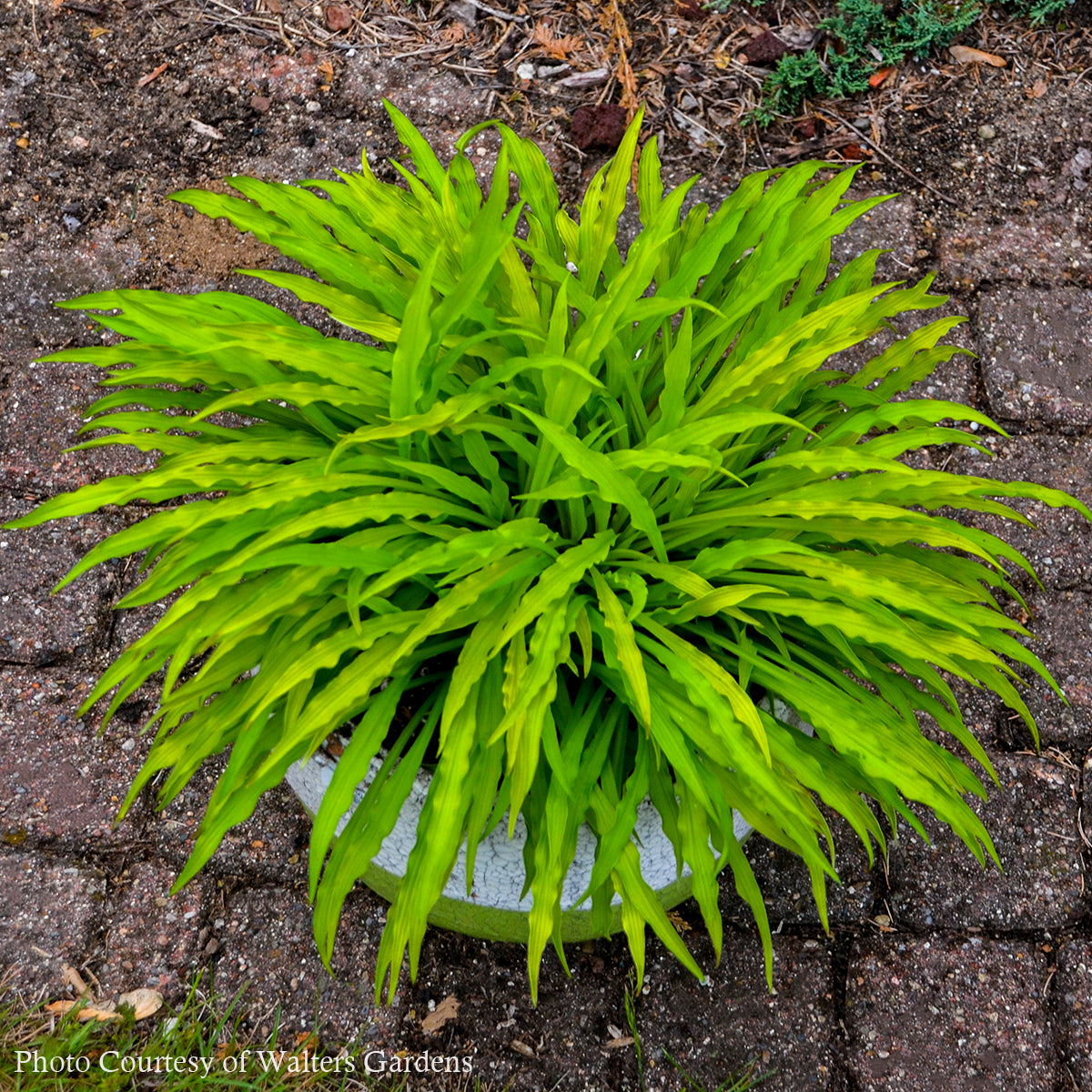 Elongated yellow to lime green leaves are here to celebrate with their wavy, wobbly edges. Lavender flowers on tall scapes attract pollinators in the summer. A fast-growing variety. Plant patented.
