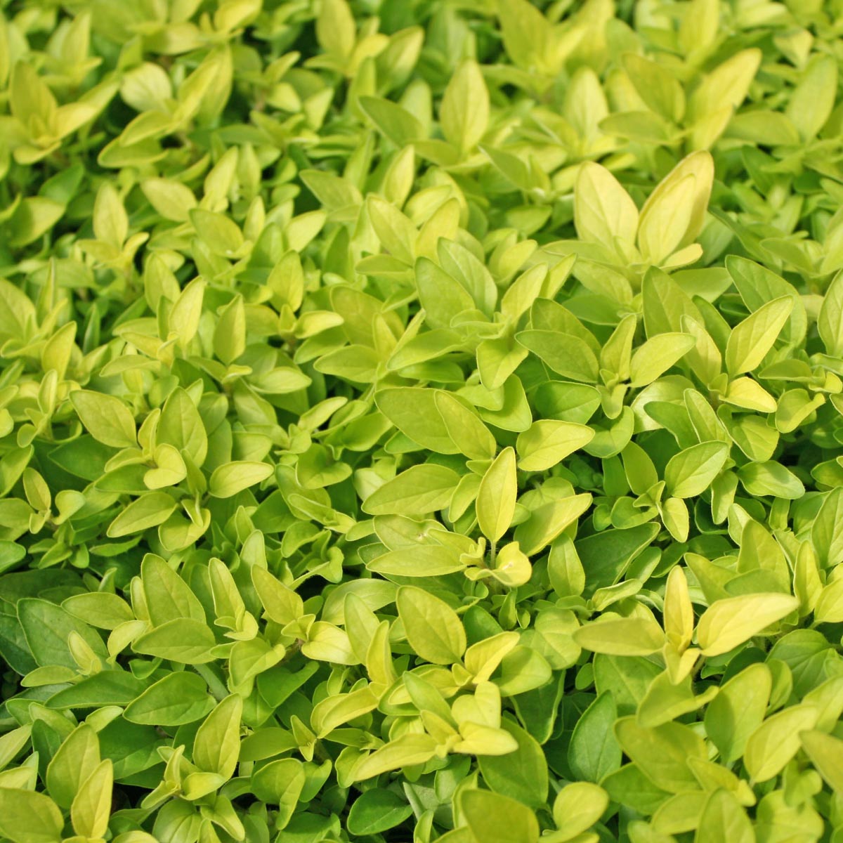 Origanum vulgare 'Aureum' is a low growing perennial with fragrant foliage that turns a lovely golden yellow to chartreuse in spring and fall. Also known as Golden Oregano or Golden Marjoram, it spreads fairly quickly to form a dense, showy ground cover that lights up shady areas. This an ornamental, but edible, herb with small lavender flowers in summer that attract butterflies.